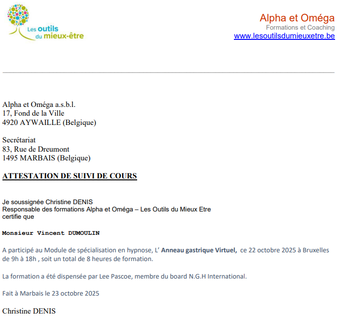J'ai eu la chance d'être formé par Messieurs Alexander Nicholls & Bernard Grosjean tous deux fondateurs du CATP et formateurs certifiés par la National Guild of Hypnotists.